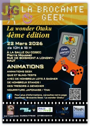 La Brocante GEEK La Wonder otaku revient pour sa 4ème édition le 22 mars à Longwy-haut (54400), à la salle des sports COSEC Pierre Mousset. De 10 h à 18 h, venez dénicher des trésors GEEK de tous genres grâce aux stands variés présents ! De plus, de nombreuses animations tels que le corner Quiz/Blindtest, le groupe Resident Evil Cosplay, des décors immersifs et bien d'autres surprises … Des cadeaux à gagner au fil de la journée ! Restauration sur place, food truck thai et une super ambiance !